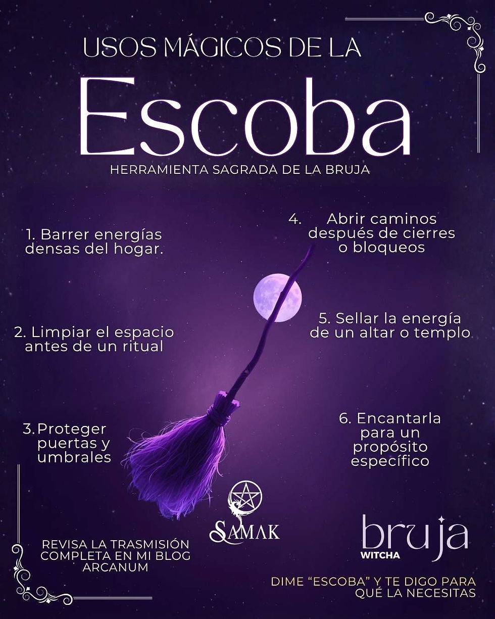 La escoba de la bruja —también llamada besom en muchas tradiciones— ha sido utilizada para limpiar energías antes de los rituales, despejar influencias densas y preparar el espacio para que la magia pueda manifestarse. En la práctica contemporánea de la Wicca y otras corrientes de brujería, su uso ritual está muy ligado a la purificación del lugar, al barrido simbólico de lo estancado y a la protección del umbral del hogar.