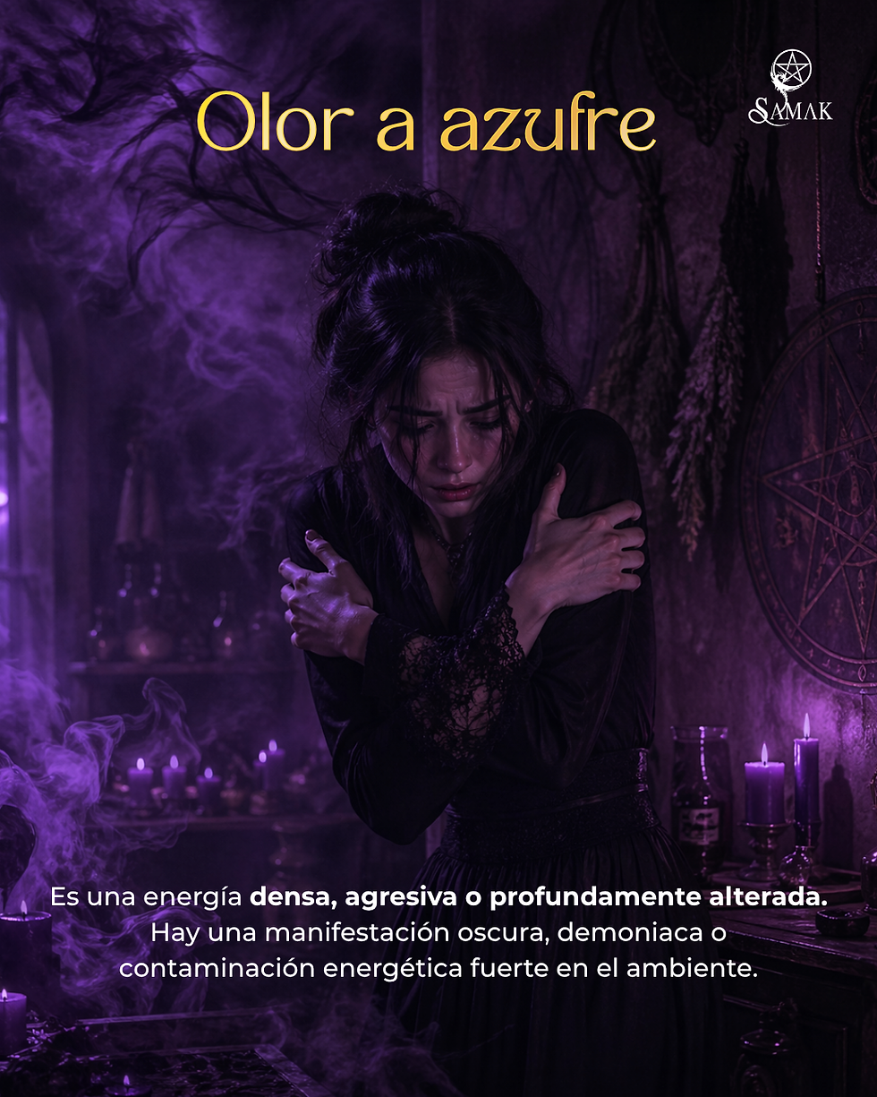 El olor a azufre suele asociarse a energías muy pesadas, alteradas o de naturaleza agresiva. Es uno de los aromas más mencionados cuando se habla de ambientes cargados, manifestaciones densas o presencias oscuras. Su aparición puede sentirse invasiva, sofocante o inquietante, y muchas veces va acompañada de ansiedad, mareo o sensación de opresión.